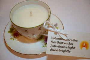 VOLUNTEERS ARE THE FIRE THAT MAKES INTERFAITHâS LIGHT SHINE BRIGHTLY – These candles were distributed to volunteers who attended Interfaithâs Annual Volunteer Appreciation Dinner on August 4, 2016. Â Â They are made from pure beeswax and coconut oil. The candles were poured with love by one of Interfaith Social Servicesâ staff members. The vessels for the candles were all donated to Interfaithâs Bureau Drawer Thrift Shop. Just like Interfaithâs volunteers each one of the vessels is unique and beautiful in their own way. Last year over 800 volunteers served within Interfaith Social Servicesâ programs. We are in awe of the service, compassion and dedication demonstrated by our volunteers every day.